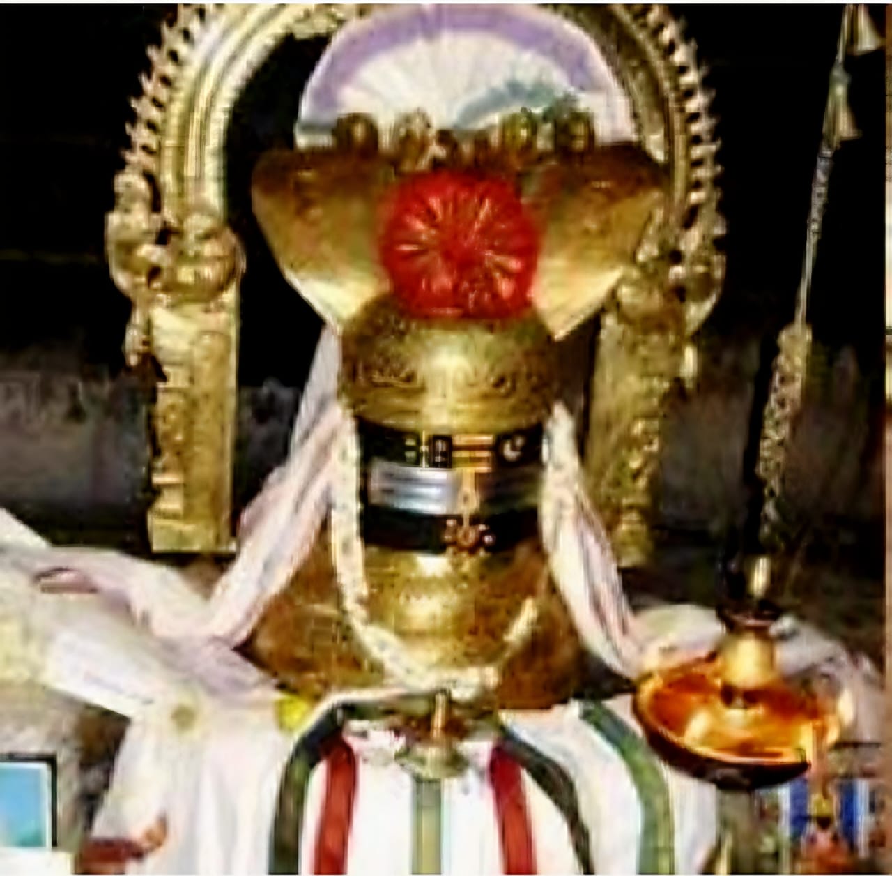 திருமங்கையாழ்வார் பெரிய திருமொழி திருவாலி திவ்ய தேச பாசுரம் செவிமடுக்க, ஆண்டாள் (கிருஷ்ணன்) முத்துக் கொண்டை சாற்றி ; அதில் சிறிய நெற்றி சுட்டித் தொங்கல் அணிந்து;வைரக்கல் அபய...